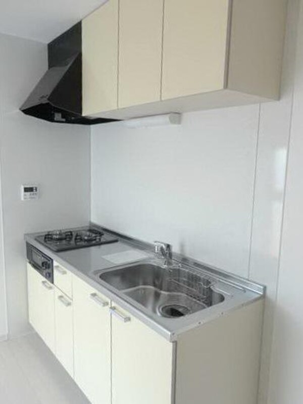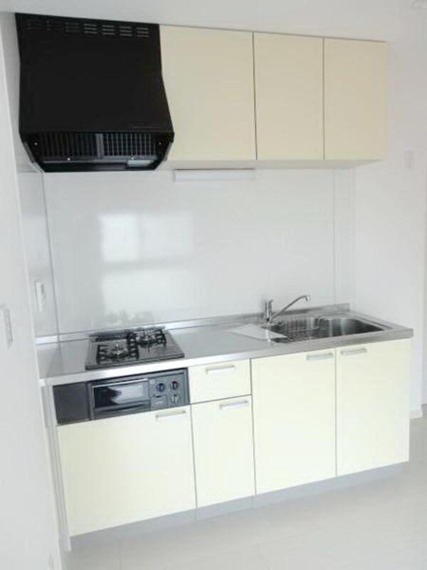 調理台、シンク、加熱調理器、レンジフード、収納庫などを一体化させたデザインのキッチン。オプションで機能を付け足すのに比べて見栄えも機能性も優れているのが特長です。画像提供:エイブル保証株式会社