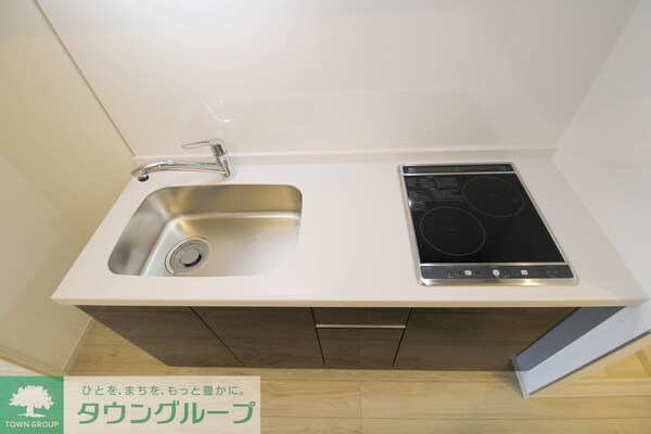調理台、シンク、加熱調理器、レンジフード、収納庫などを一体化させたデザインのキッチン。オプションで機能を付け足すのに比べて見栄えも機能性も優れているのが特長です。画像提供:エイブル保証株式会社