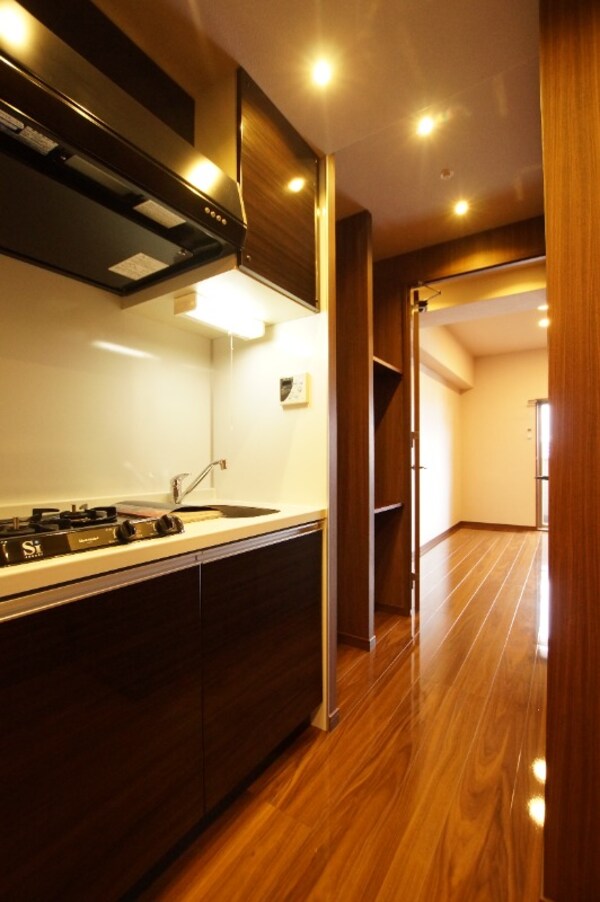 調理台、シンク、加熱調理器、レンジフード、収納庫などを一体化させたデザインのキッチン。オプションで機能を付け足すのに比べて見栄えも機能性も優れているのが特長です。画像提供:エイブル保証株式会社