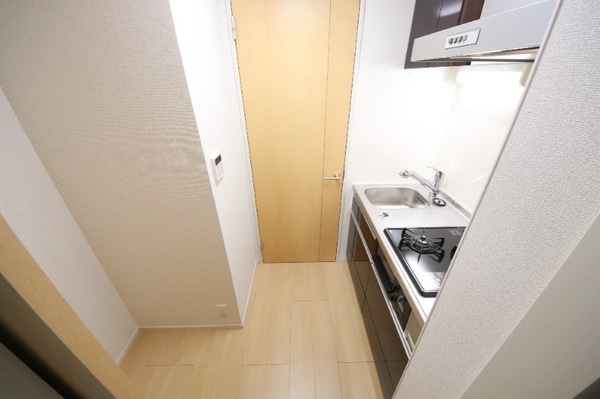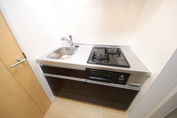 調理台、シンク、加熱調理器、レンジフード、収納庫などを一体化させたデザインのキッチン。オプションで機能を付け足すのに比べて見栄えも機能性も優れているのが特長です。画像提供:エイブル保証株式会社