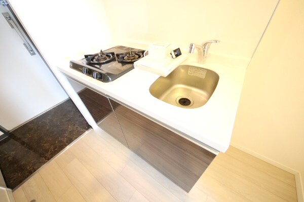 調理台、シンク、加熱調理器、レンジフード、収納庫などを一体化させたデザインのキッチン。オプションで機能を付け足すのに比べて見栄えも機能性も優れているのが特長です。画像提供:エイブル保証株式会社