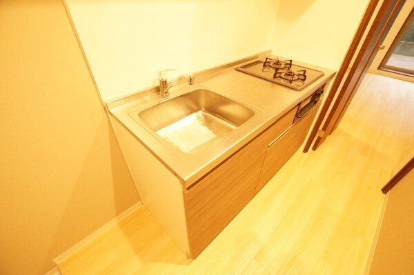 調理台、シンク、加熱調理器、レンジフード、収納庫などを一体化させたデザインのキッチン。オプションで機能を付け足すのに比べて見栄えも機能性も優れているのが特長です。画像提供:エイブル保証株式会社