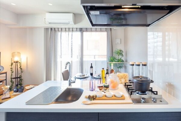 調理台、シンク、加熱調理器、レンジフード、収納庫などを一体化させたデザインのキッチン。 オプションで機能を付け足すのに比べて見栄えも機能性も優れているのが特長です。 画像提供:エイブル保証株式会社