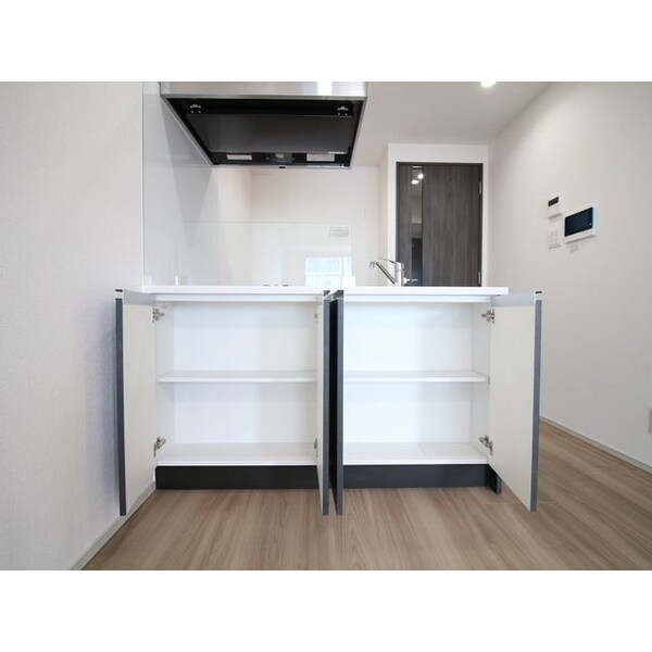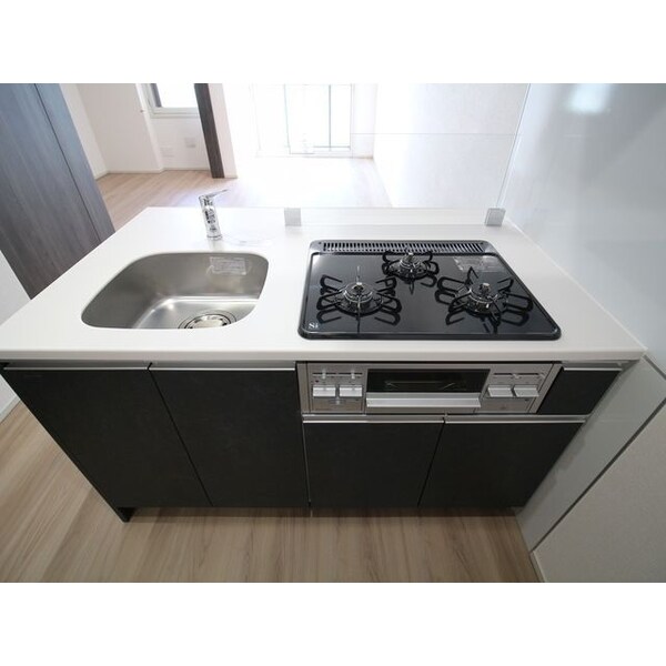 調理台、シンク、加熱調理器、レンジフード、収納庫などを一体化させたデザインのキッチン。オプションで機能を付け足すのに比べて見栄えも機能性も優れているのが特長です。画像提供:エイブル保証株式会社