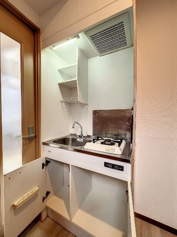 調理台、シンク、加熱調理器、レンジフード、収納庫などを一体化させたデザインのキッチン。オプションで機能を付け足すのに比べて見栄えも機能性も優れているのが特長です。画像提供:エイブル保証株式会社
