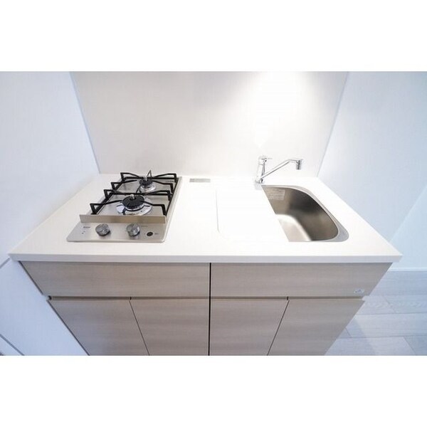 調理台、シンク、加熱調理器、レンジフード、収納庫などを一体化させたデザインのキッチン。オプションで機能を付け足すのに比べて見栄えも機能性も優れているのが特長です。画像提供:エイブル保証株式会社