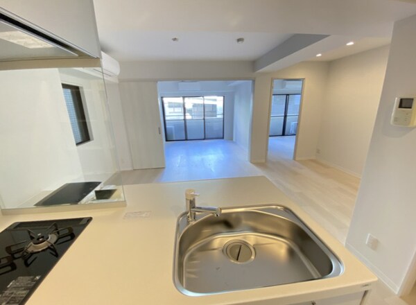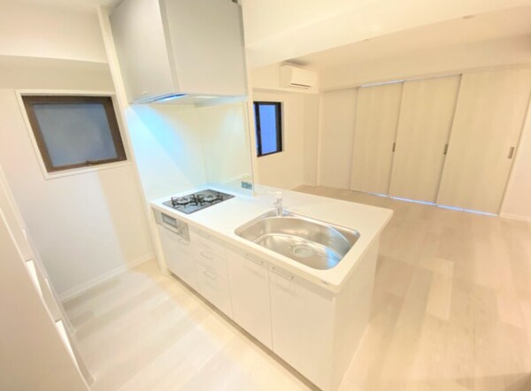 調理台、シンク、加熱調理器、レンジフード、収納庫などを一体化させたデザインのキッチン。オプションで機能を付け足すのに比べて見栄えも機能性も優れているのが特長です。画像提供:エイブル保証株式会社