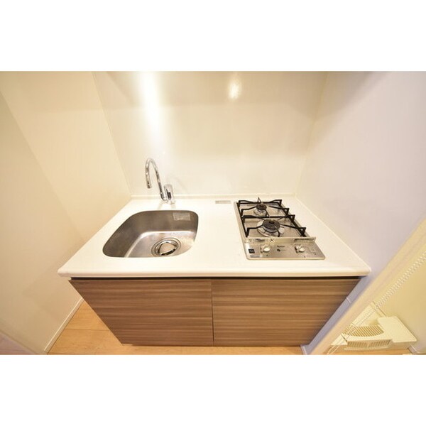調理台、シンク、加熱調理器、レンジフード、収納庫などを一体化させたデザインのキッチン。オプションで機能を付け足すのに比べて見栄えも機能性も優れているのが特長です。画像提供:エイブル保証株式会社