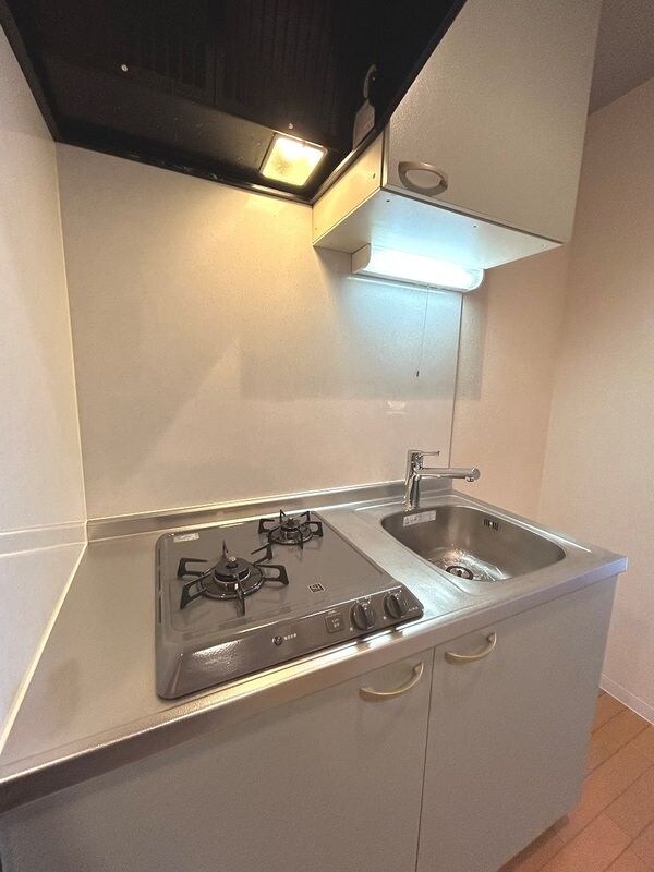 調理台、シンク、加熱調理器、レンジフード、収納庫などを一体化させたデザインのキッチン。オプションで機能を付け足すのに比べて見栄えも機能性も優れているのが特長です。画像提供:エイブル保証株式会社