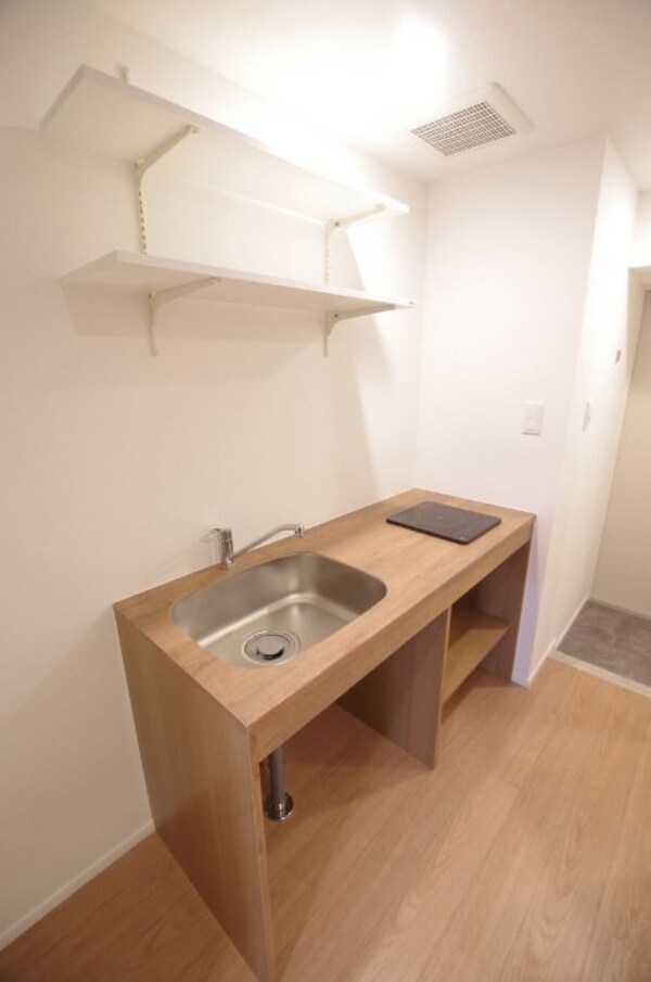 調理台、シンク、加熱調理器、レンジフード、収納庫などを一体化させたデザインのキッチン。オプションで機能を付け足すのに比べて見栄えも機能性も優れているのが特長です。画像提供:エイブル保証株式会社