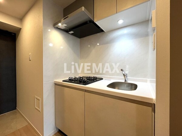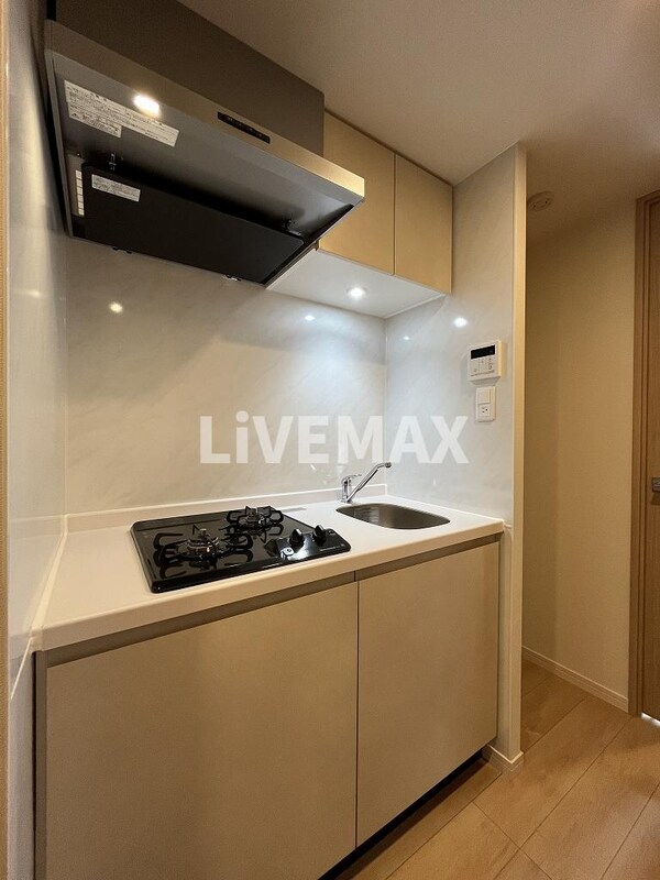 調理台、シンク、加熱調理器、レンジフード、収納庫などを一体化させたデザインのキッチン。オプションで機能を付け足すのに比べて見栄えも機能性も優れているのが特長です。画像提供:エイブル保証株式会社