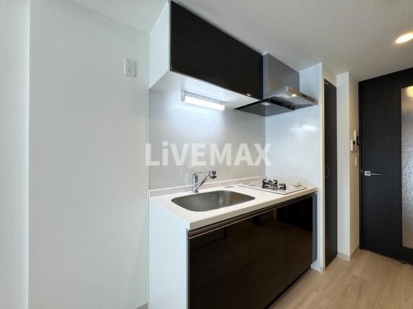 調理台、シンク、加熱調理器、レンジフード、収納庫などを一体化させたデザインのキッチン。オプションで機能を付け足すのに比べて見栄えも機能性も優れているのが特長です。画像提供:エイブル保証株式会社