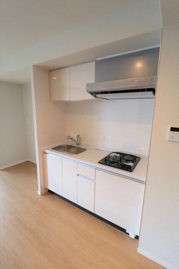 調理台、シンク、加熱調理器、レンジフード、収納庫などを一体化させたデザインのキッチン。オプションで機能を付け足すのに比べて見栄えも機能性も優れているのが特長です。画像提供:エイブル保証株式会社