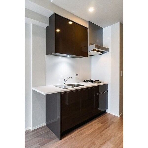 調理台、シンク、加熱調理器、レンジフード、収納庫などを一体化させたデザインのキッチン。 オプションで機能を付け足すのに比べて見栄えも機能性も優れているのが特長です。 画像提供:エイブル保証株式会社