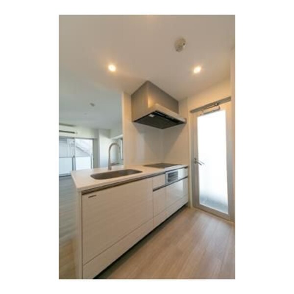 調理台、シンク、加熱調理器、レンジフード、収納庫などを一体化させたデザインのキッチン。オプションで機能を付け足すのに比べて見栄えも機能性も優れているのが特長です。画像提供:エイブル保証株式会社