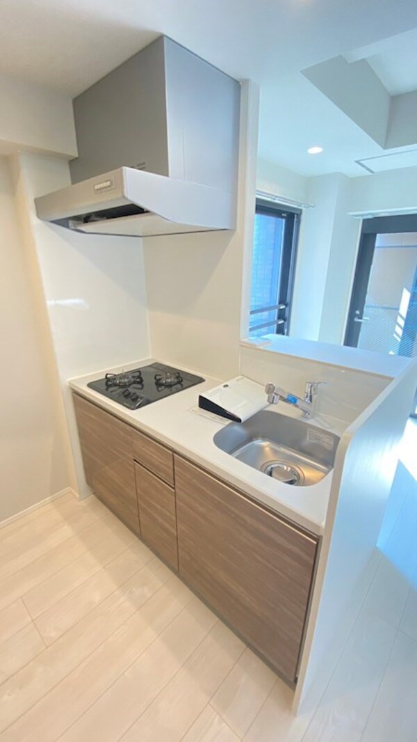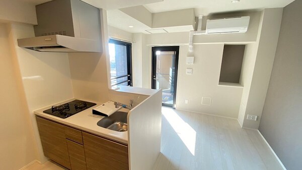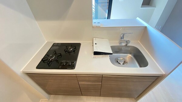 調理台、シンク、加熱調理器、レンジフード、収納庫などを一体化させたデザインのキッチン。オプションで機能を付け足すのに比べて見栄えも機能性も優れているのが特長です。画像提供:エイブル保証株式会社