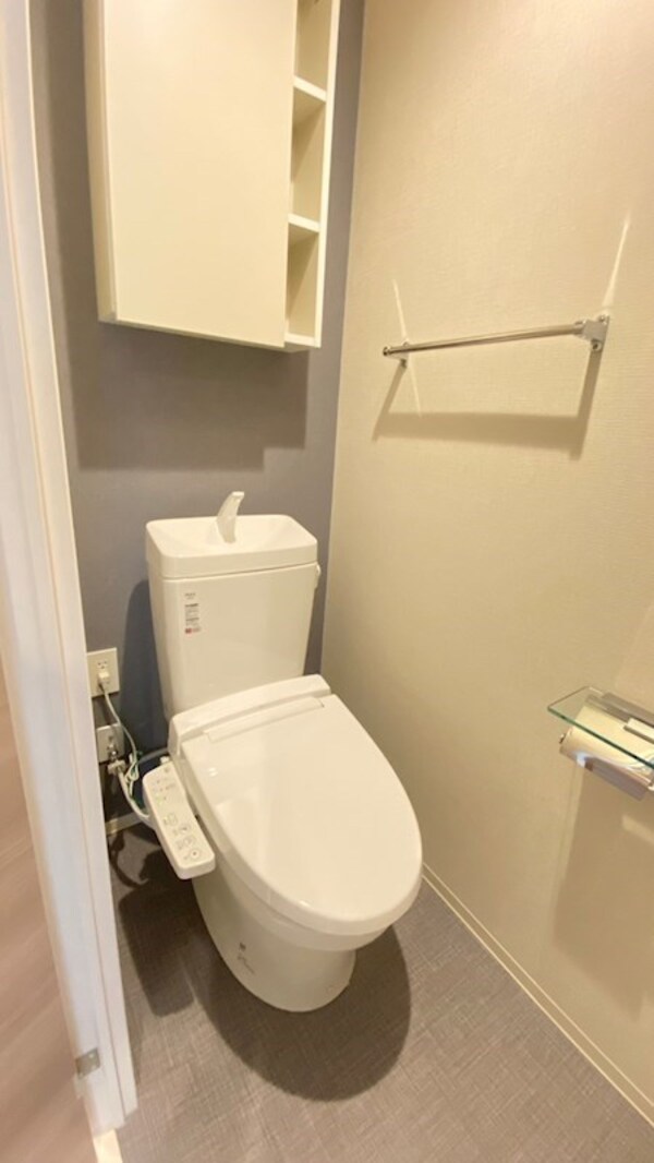 温水洗浄機能が付いた便座。温水で洗う事によりトイレットペーパーの消費量を抑えることができ、汚れも落ちやすくなり衛生的!
