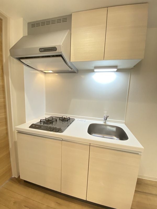 調理台、シンク、加熱調理器、レンジフード、収納庫などを一体化させたデザインのキッチン。オプションで機能を付け足すのに比べて見栄えも機能性も優れているのが特長です。画像提供:エイブル保証株式会社
